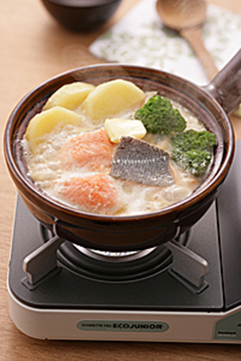 - 高汤入锅,中火熬煮,土豆沥干后放入锅中。煮开后调小火煮5分钟,加入鲑鱼肉和蔬菜。蔬菜变软后加入鲜牛奶,用调料A调味后加黄油即可。